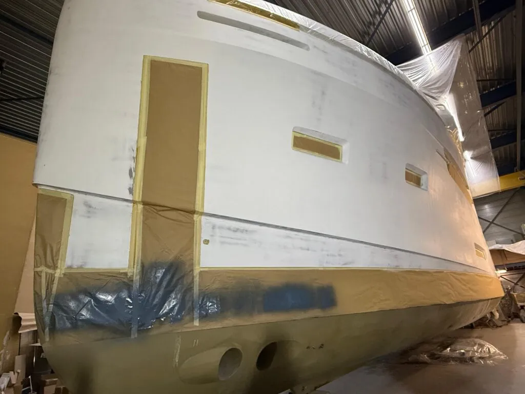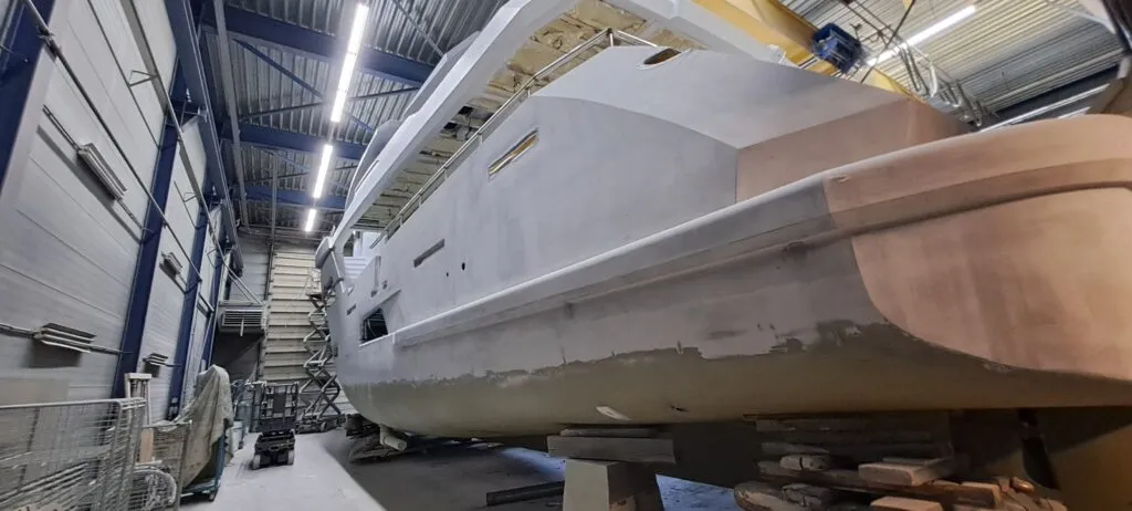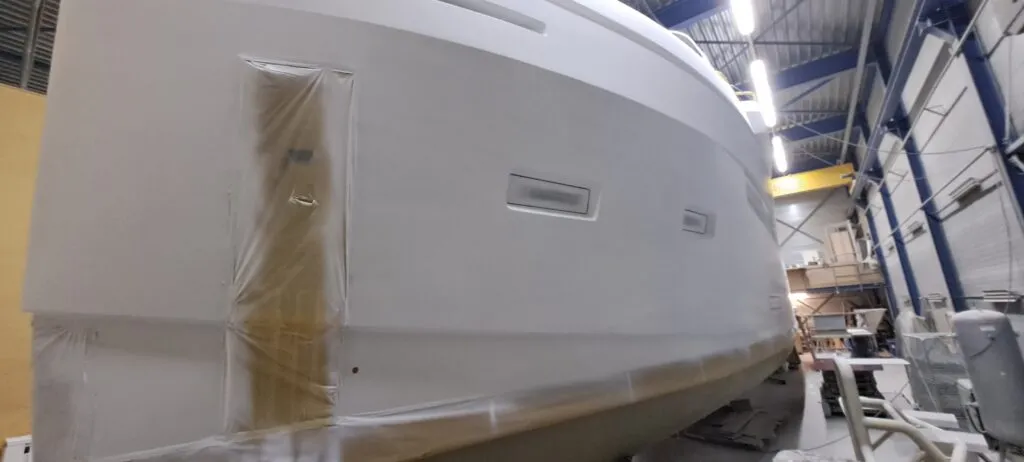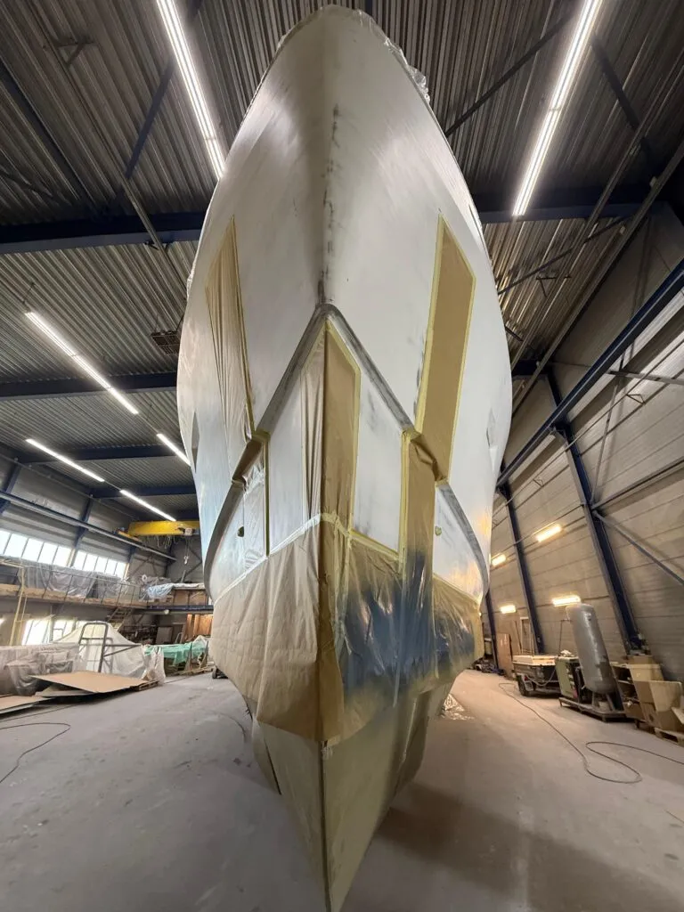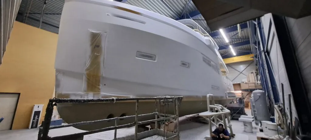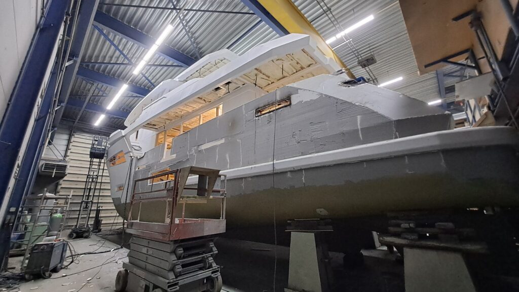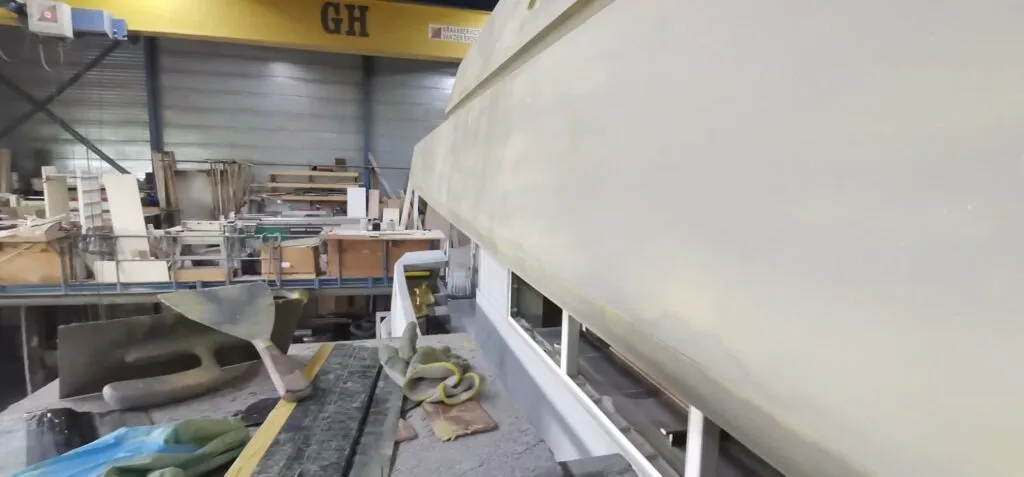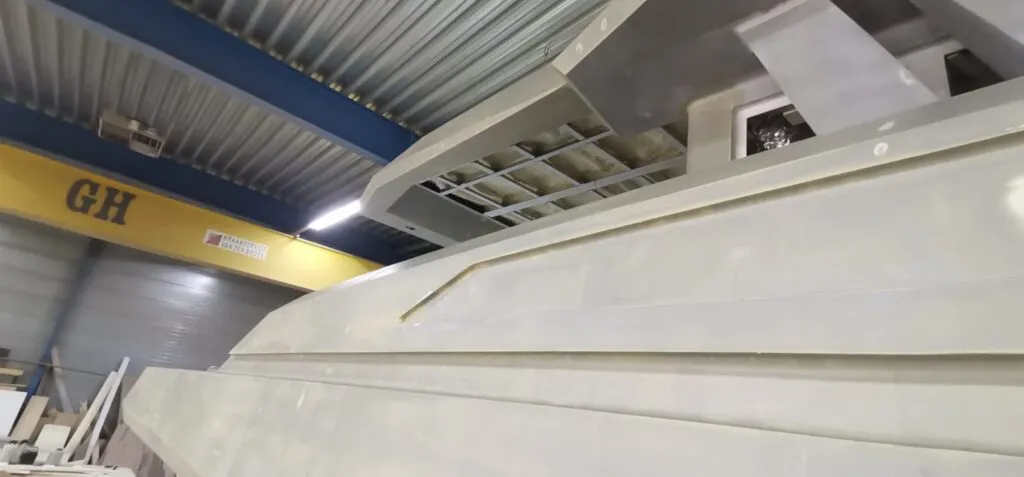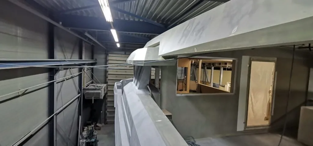 Οι τεχνικοί δουλεύουν την πλήρωση με ακρίβεια, εξασφαλίζοντας ομαλές επιφάνειες και καθαρές γραμμές που αναδεικίζουν τις καμπύλες και τις γωνίες του σκάφους.