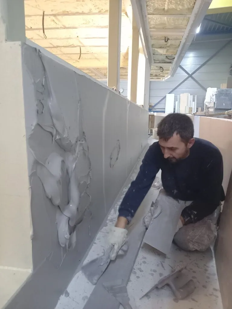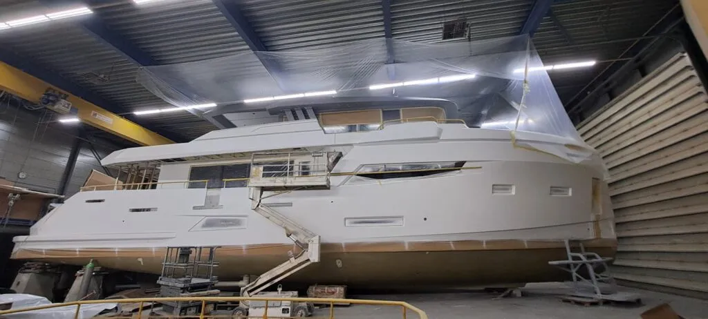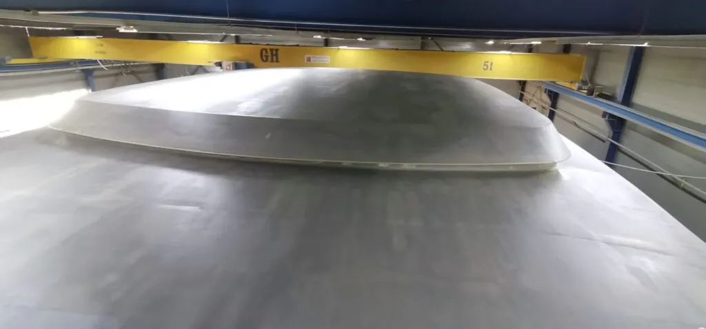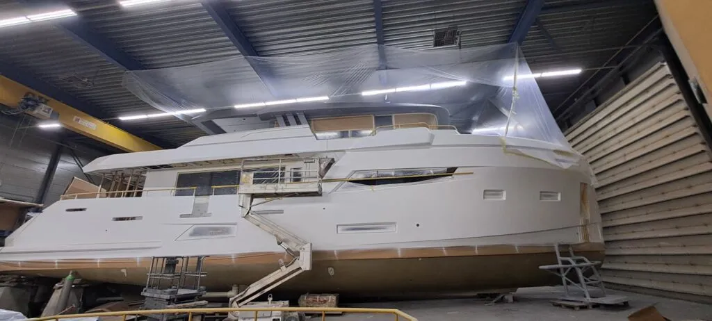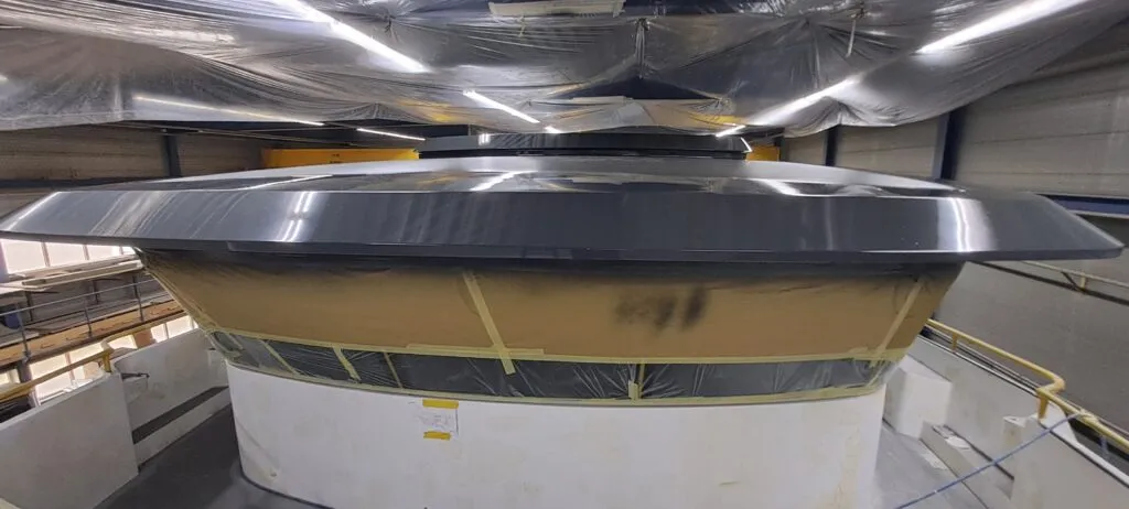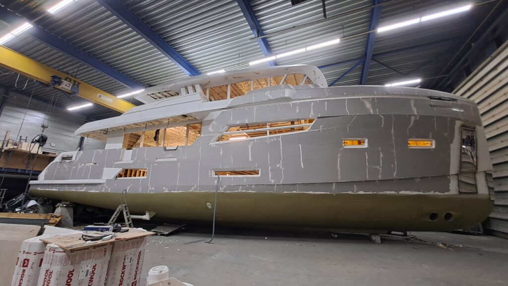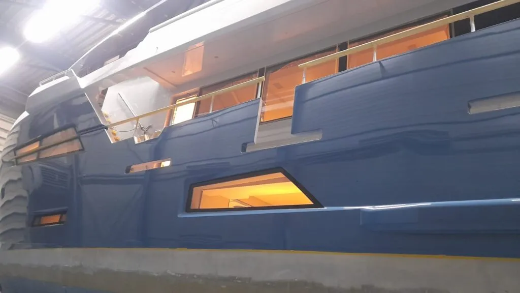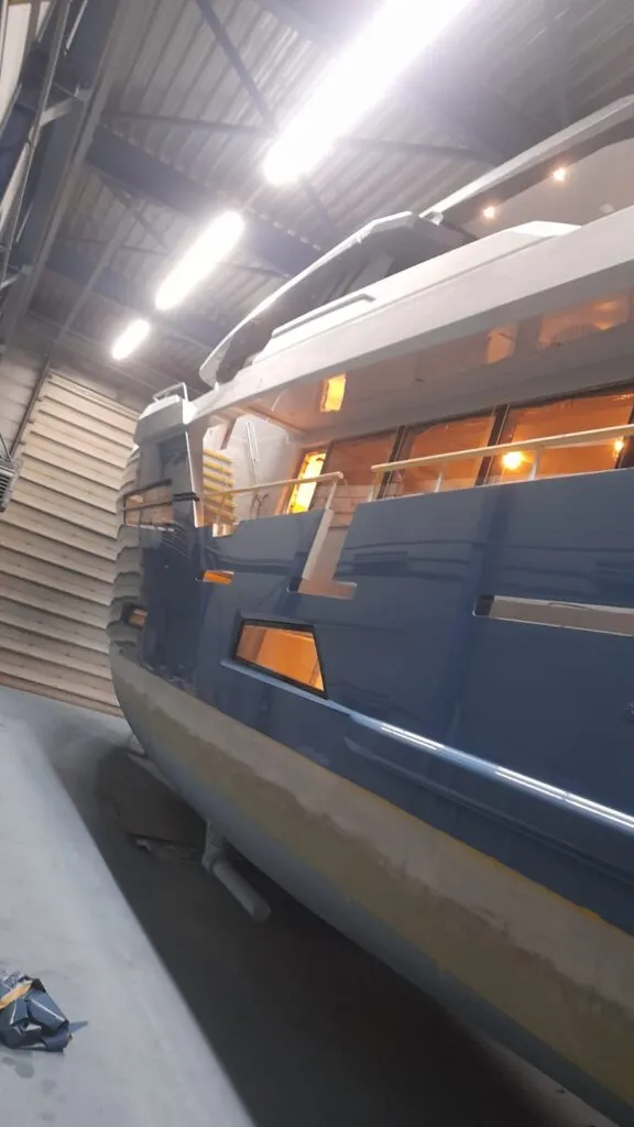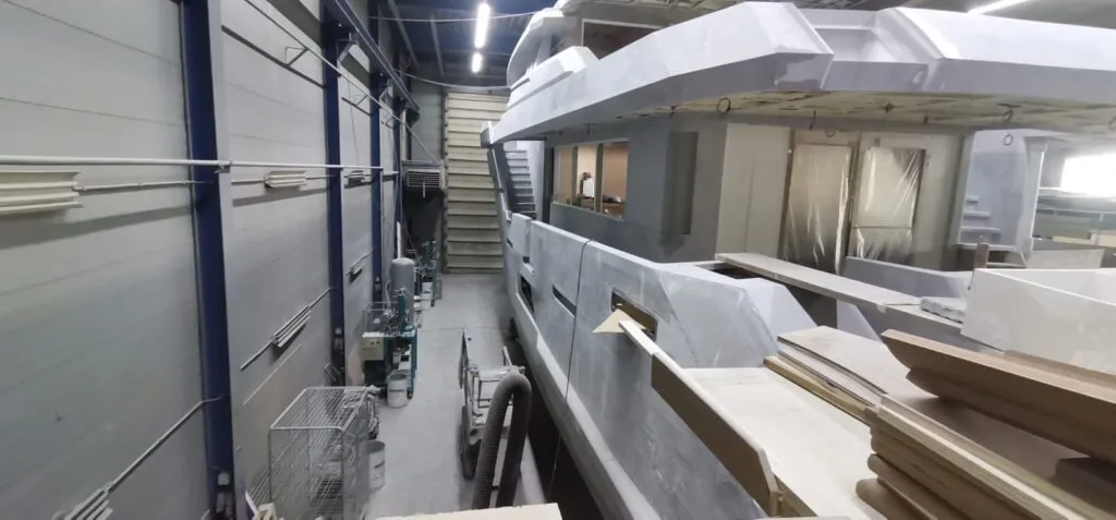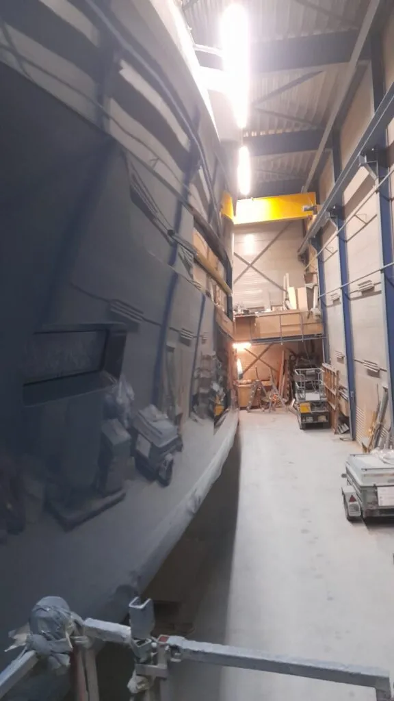 Οι τεχνικοί δουλεύουν την πλήρωση με ακρίβεια, εξασφαλίζοντας ομαλές επιφάνειες και καθαρές γραμμές που αναδεικίζουν τις καμπύλες και τις γωνίες του σκάφους.