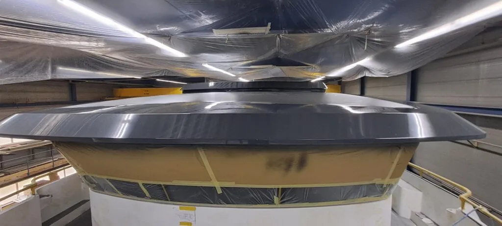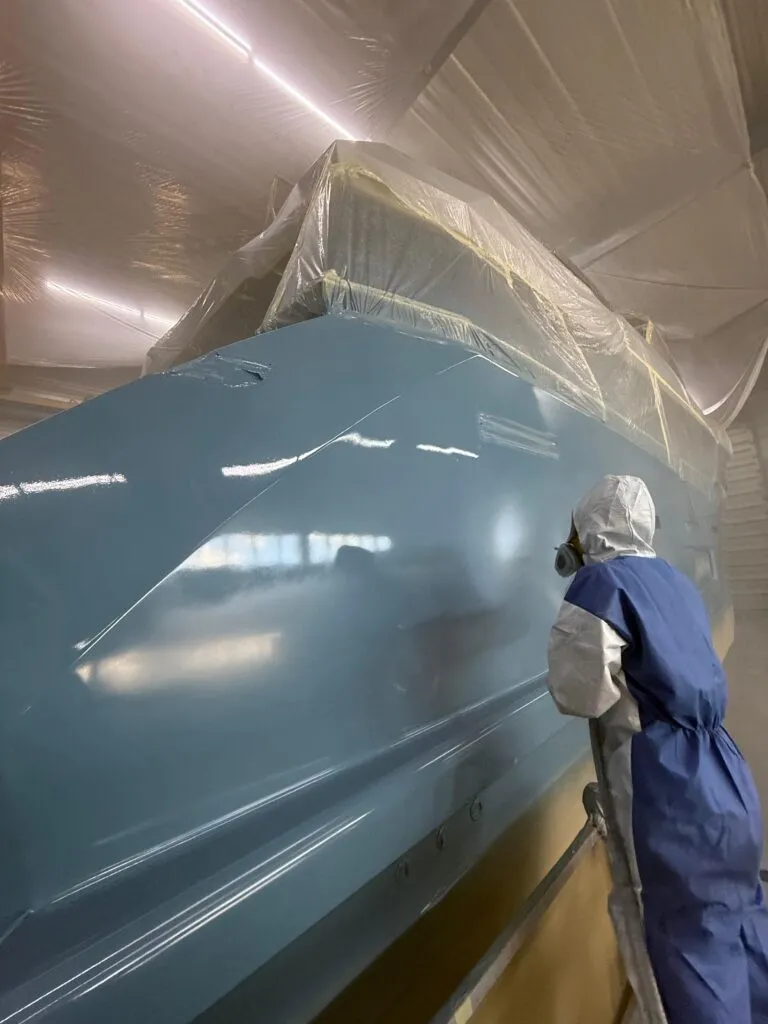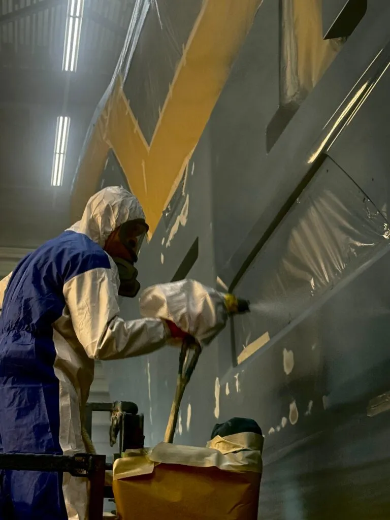 Στο στάδιο του χρωματισμού, η ομάδα εφαρμόζει υλικά μεγάλης αντοχής σε προσεγμένα στρώματα, δίνοντας στο σώμα του σκάφους προστασία και βάθος.